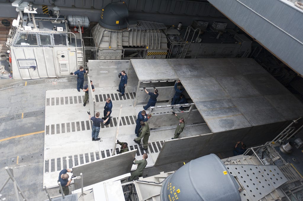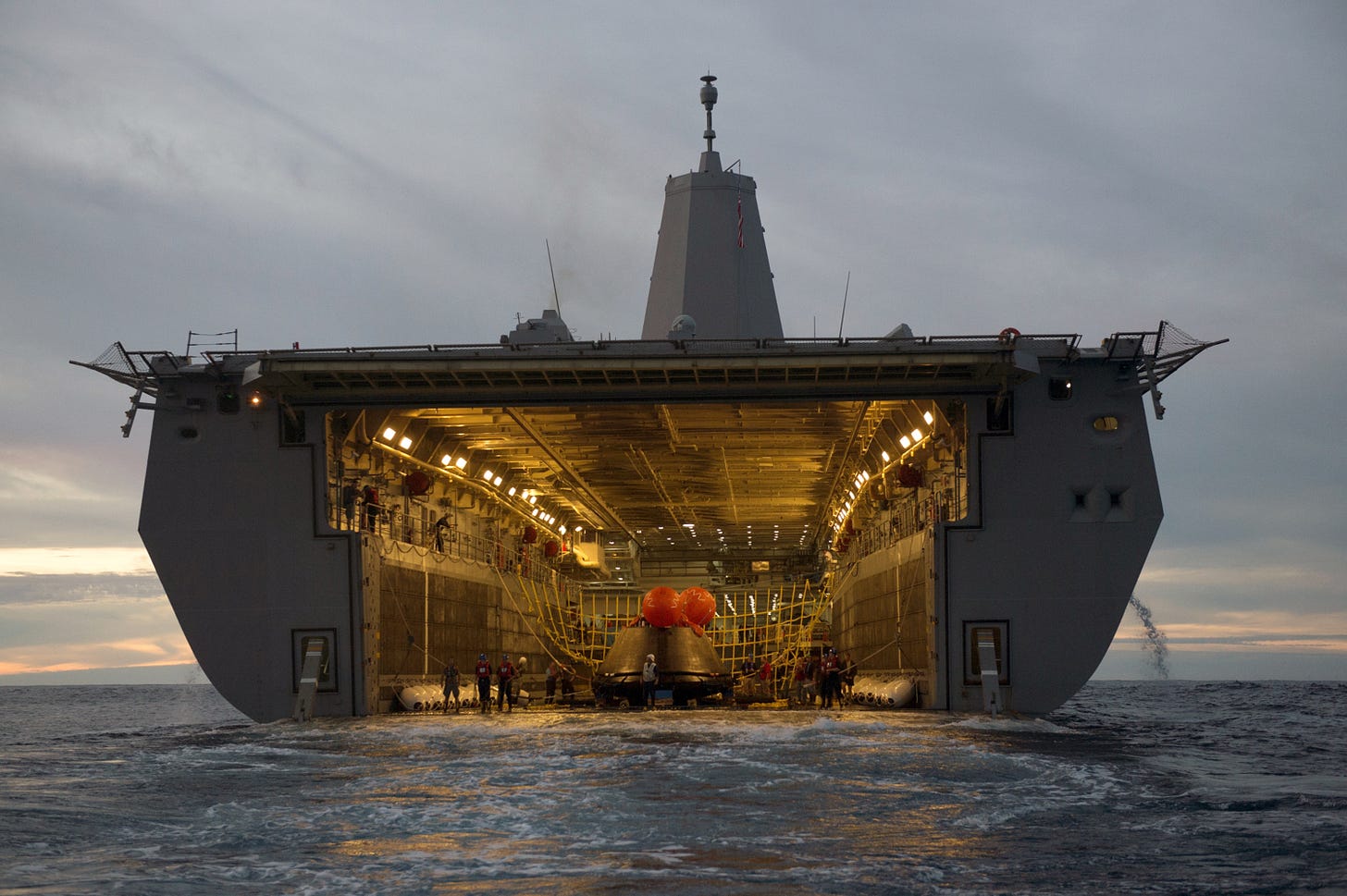 Roughly twenty Navy personnel in blue coveralls and hardhats marshaled the hovercraft into the Highland’s aft well deck.