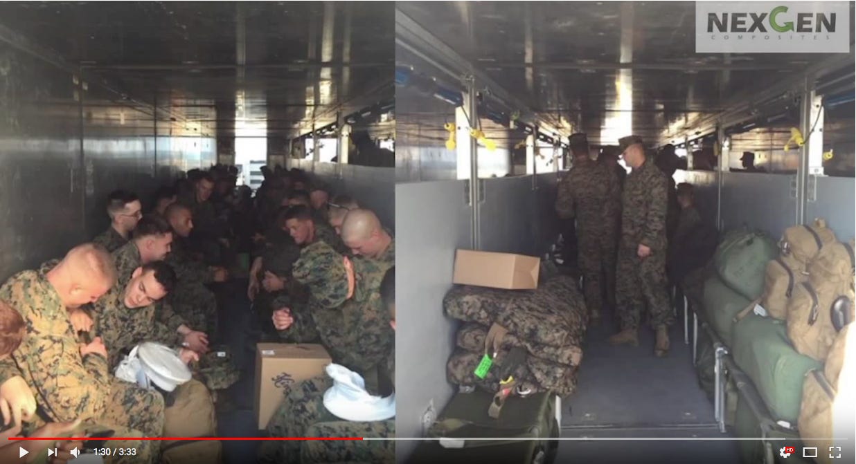 On the deck of the lead hovercraft sat a large, gray, metal container—bolted down with thick cargo chains. Three open doors lined its front, each manned by a Marine.