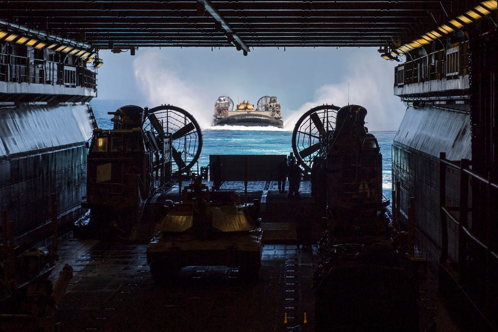 The U.S. Navy’s assault hovercraft loomed like dark silhouettes against the shimmering Pacific.